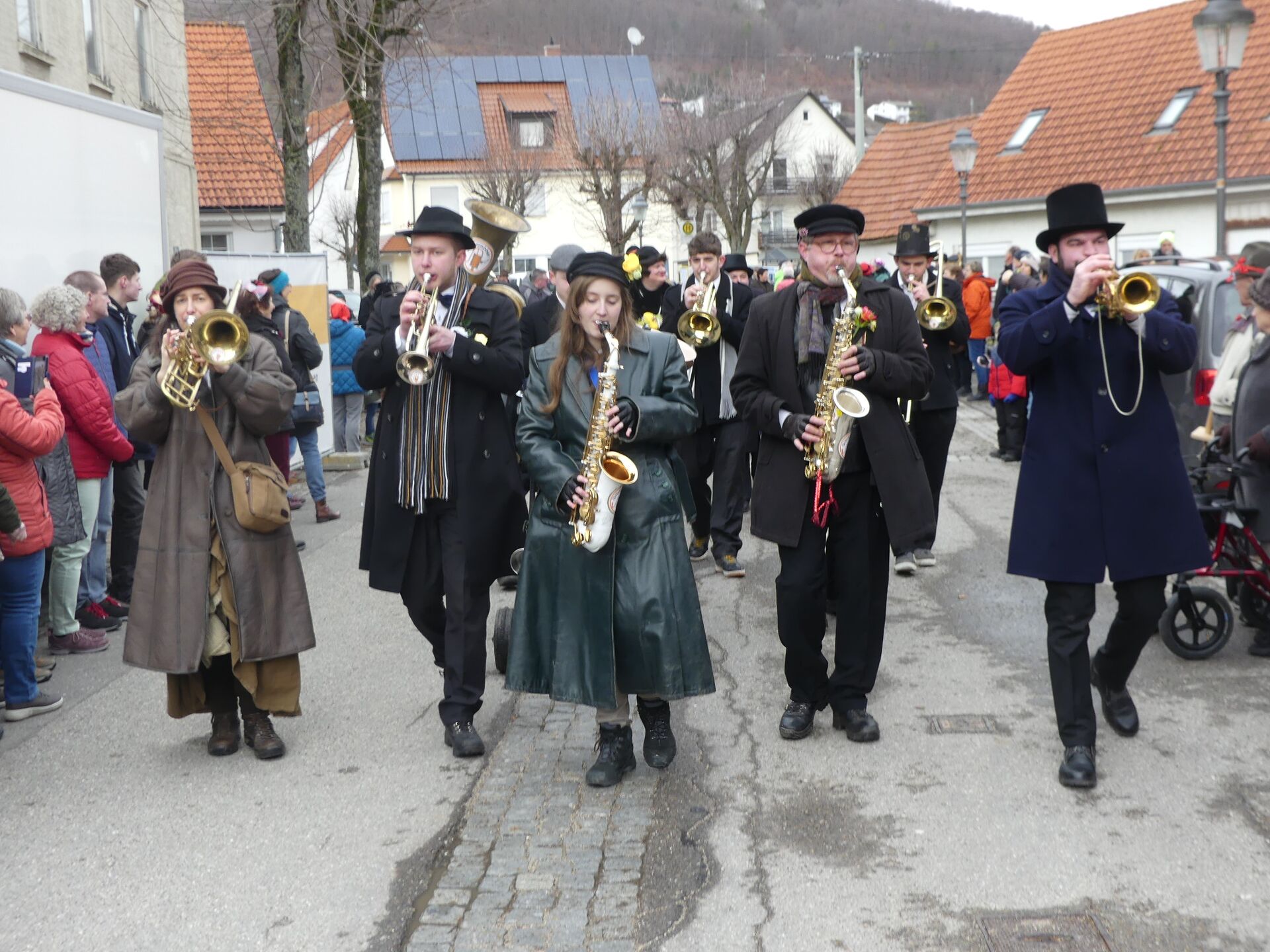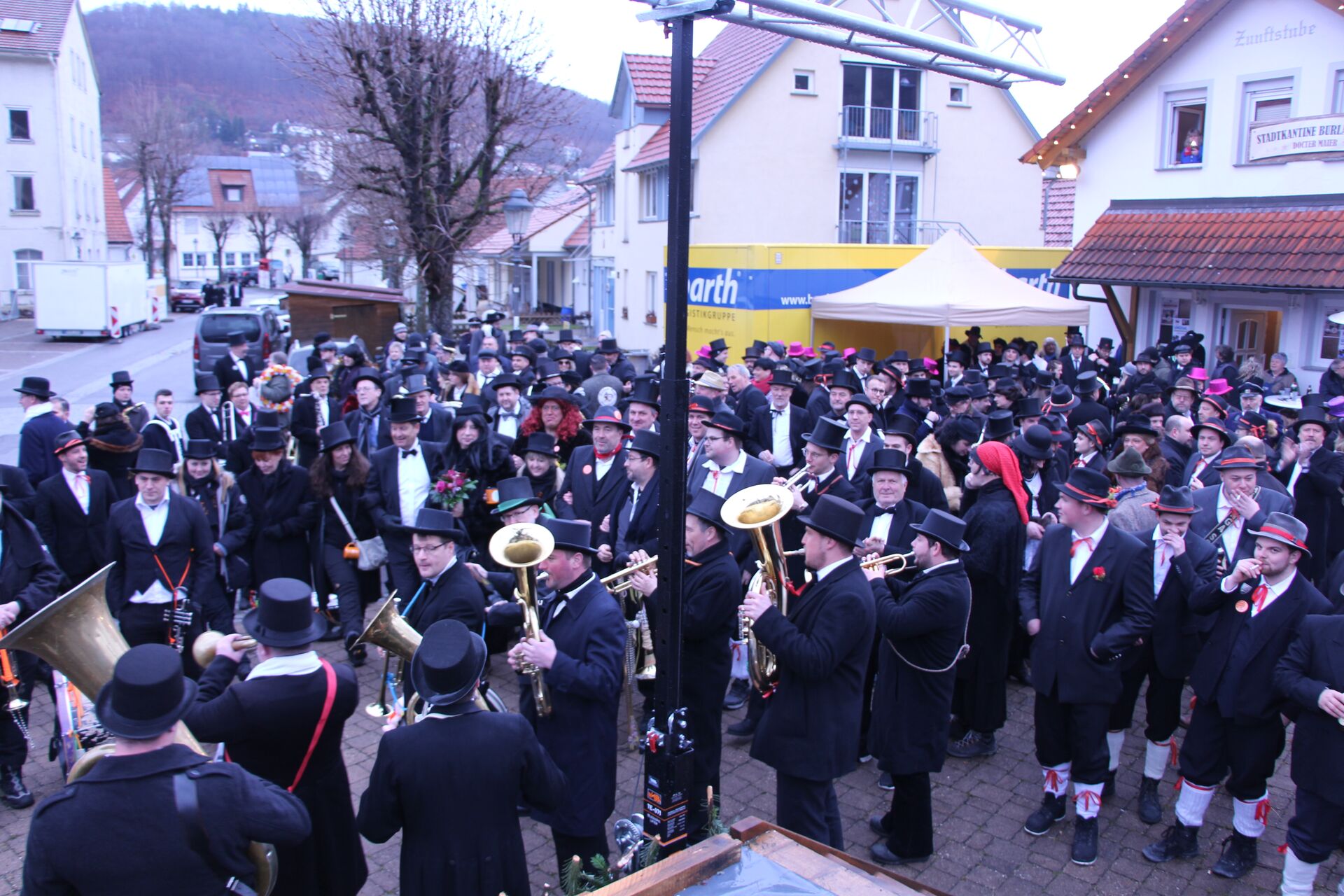 Alles fieberte nach zwei Ausfällen auf das diesjährige Fasnetsspiel hin. Und es gab noch mehr her, als es versprach. Zum einen mag die Abstinenz schuld gewesen sein, dass so viele an dem Spektakel teilnahmen, zum anderen war es aber auch das Wetter, das sich von Stunde zu Stunde besserte, je näher es auf das Fasnetsspiel zuging. 14 Lumpenkapellen der Gesamtstadt, über 60 Hochzeitslader und Kassenbuben und zehn Fasnetsspieler, also mehr als 250 Narren, trafen sich bereit am Morgen zum Frühstück in der Zunftstube.