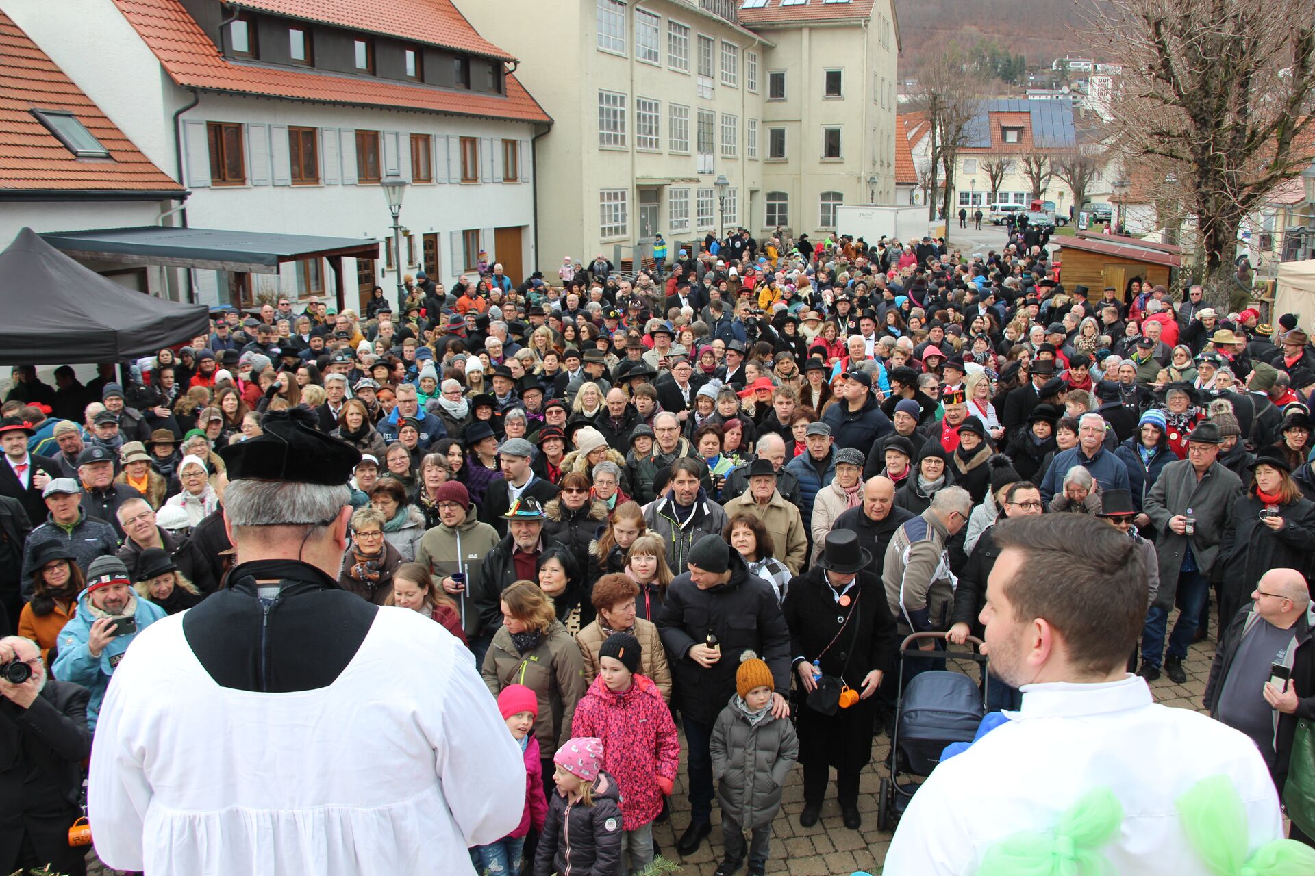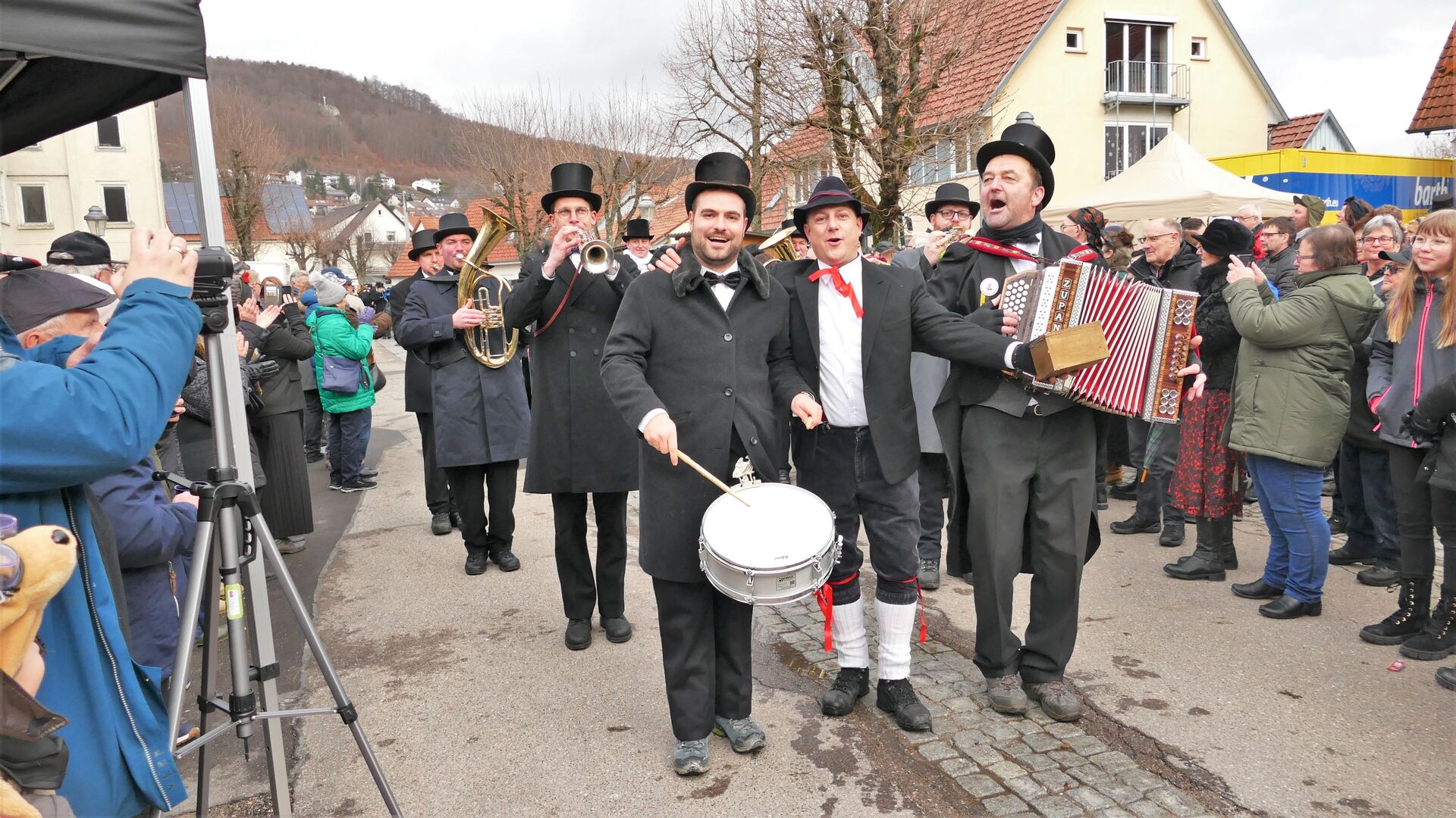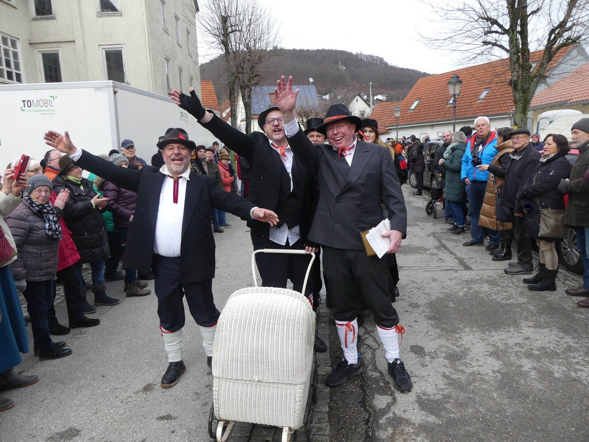 Dann zogen sie los und klingelten (fast) an jeder Haustüre. Unter den Kassenbuben der Europaabgeordnete Andreas Glück, die Landtagsabgeordneten Rudi Fischer, Manuel Hailfinger und Joachim Steyer, Bürgermeister Davide Licht, der Chefredakteur des Schwarzwälder Boten Constantin Blaß sowie Priester Klaus Käfer, Diakon Ralf Rötzel, der Rektor des Progymnasium Johannes Heß, der erste Beigeordnete Berthold Wiesner und Peter Spallinger der Ortsvorsitzende des DRK. Nach dem Frühstück trafen sich alle vor dem Fasnetsspielwagen.