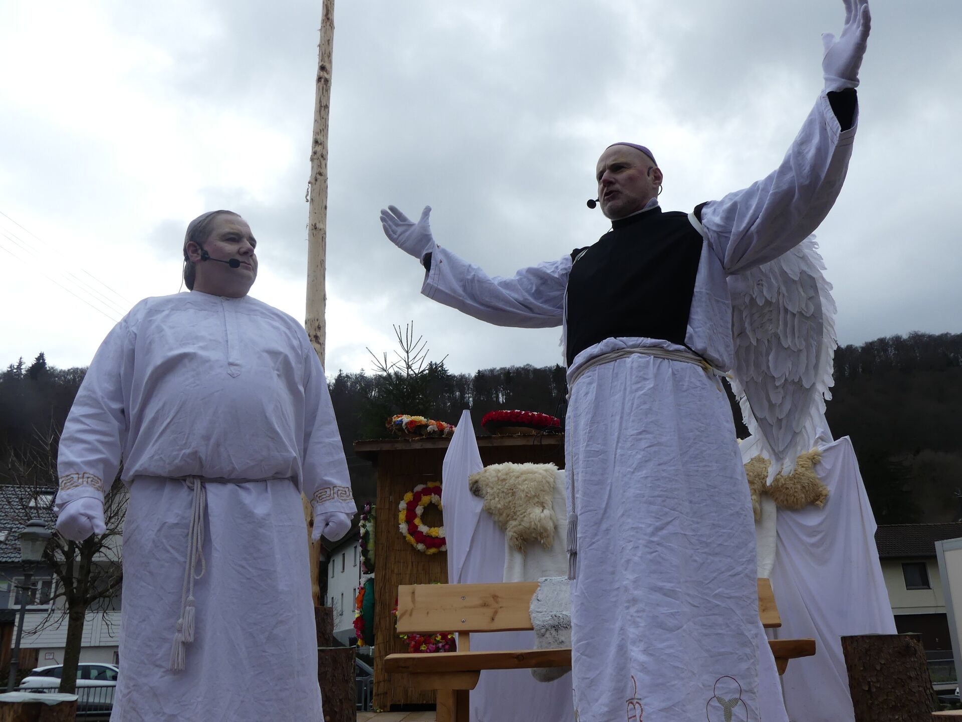 Dann war erstmals Läufer Oli Acker an der Reihe: ´s eiste mol däf i do hoba auf dr Bühne stau, und ui verzehla, was ma im Ort hot so dau. Also herat guat zua und standet na, weils jedem a mol so ganga ka.“ Am Ende verabschiedete er seinen Vorgänger Johannes Leibold, der zuvor 15 Mal diese Rolle inne hat und danach erstmals als Fasnetsspieler fungierte. Des wars scho fast, aber ois däff i it vergässa, i bitt auf die Bühne dr Johannes Leibold alias Haifresser.“