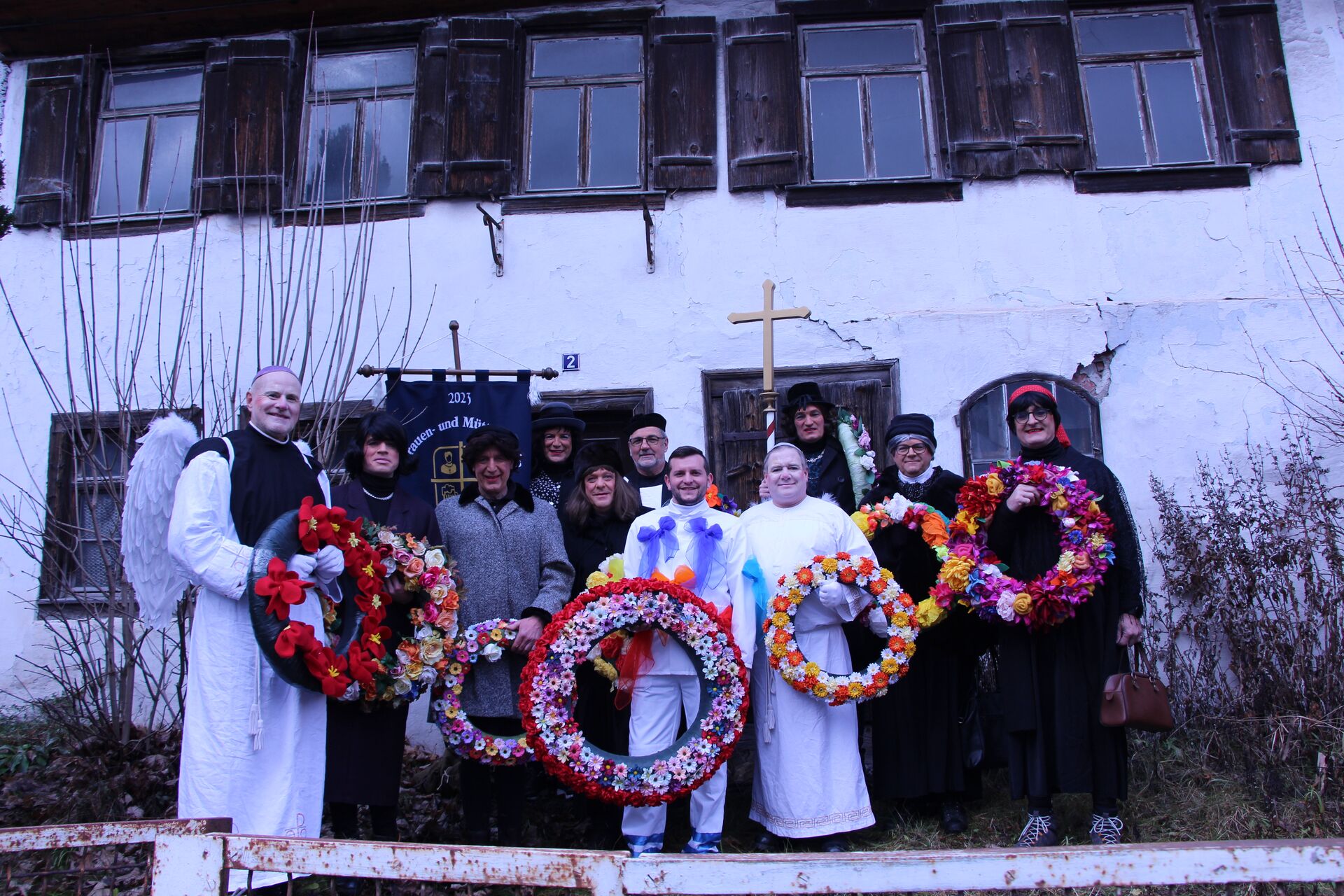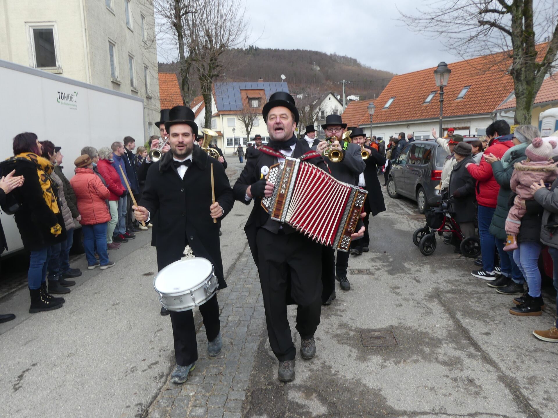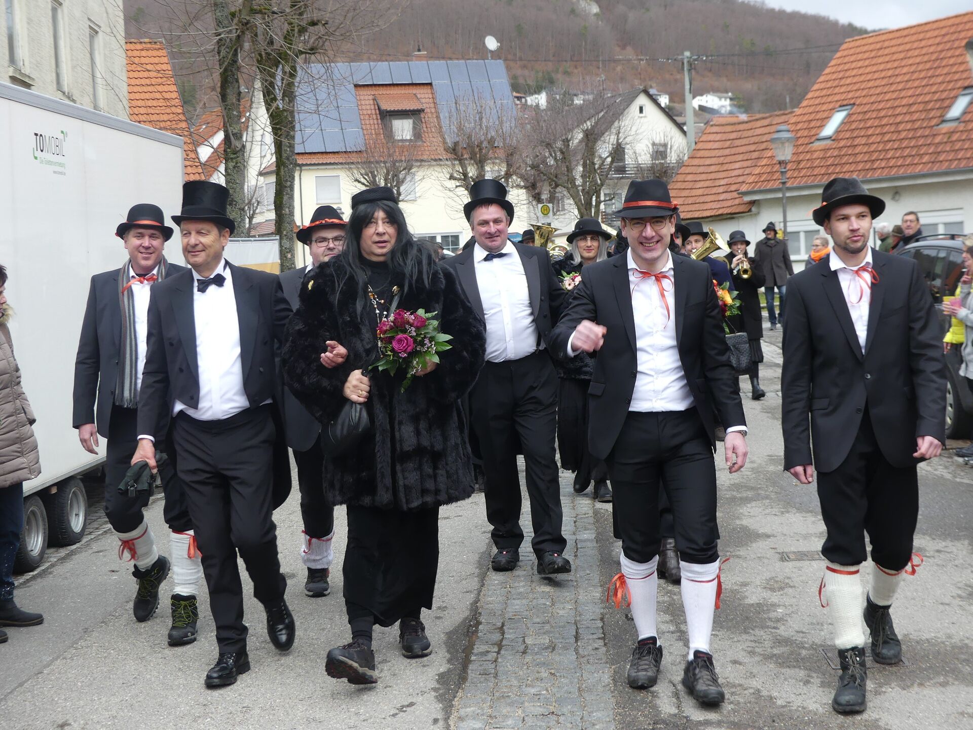 Josef Entreß, Zunftmeister, begrüßte alle herzlich, Fasnetsspielleiter Hubert Pfister gab noch einmal die letzten Instruktionen preis und verteilte Fasnetsspielhefte und Holzkassen. Dann war Joachim Gerlach mit dem traditionellen Brautspruch, politisch wie selten, an der Reihe. „Dann kam es wia es komma muas, ein Virus sich über dia Welt ergoss. Ein mancher musste daran sterben, den Rest erledigte Merkels Schärgen. Eigschperrt händ se oin, ma glaubt es kaum, jeden in an extra Raum. Hoscht de mol nausgschlicha, hoscht des probiert, hot de dr Nochber denunziert. Des händ mt schau mol ket, vor 80-90 Johr, als Adolf an dr Regierung war.“ Aber er sah auch positiv in die Zukunft: Wa bin i froh, ihr liabe leit, dass es wieder a reachte Fasnet geit. Bockboinig und gradaus, gangamer wieder aus am Haus. Jedem zur freud und niemand zum leid, hand mir älle wieder a mords feid.“