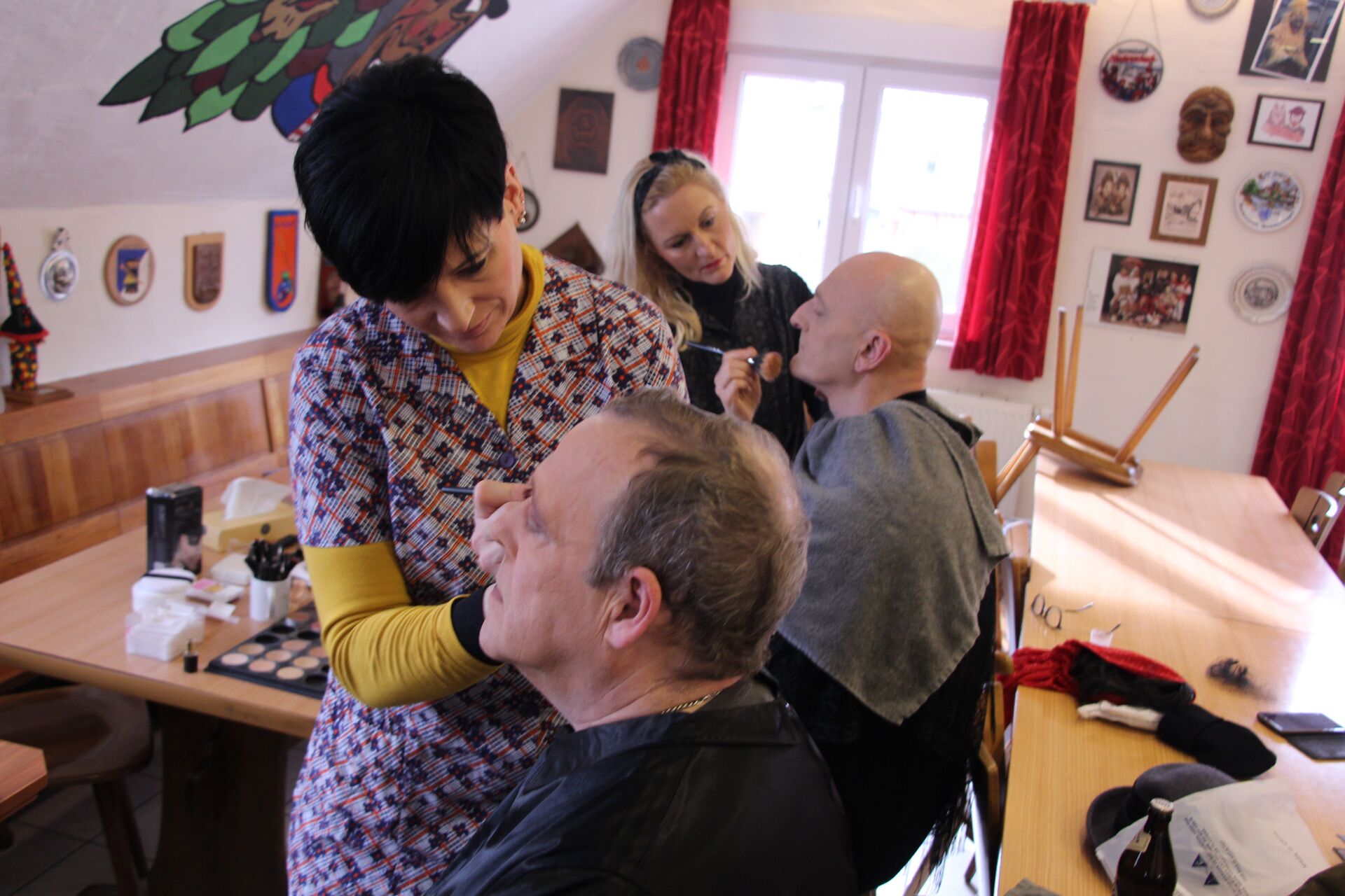 Dann kam das eigentliche Fasnetsspiel. Michael Mauz als Bürgermeisterin Maria Huber, Simon Riehle als Lehrerin Fräulein Olga, Johannes Holzer als Bäuerin Maria Scheu, Hubert Pfister als die Kramerin Lisl Huber, Eberhard Brunner als Rosa Häberle und erstmals auf der Bühne Eckhard Boss als Mesnerin Walburga Maier und Johannes Leibold als Chorleiterin Fräulein Kunigunde. Die einzige Männerrolle hate Josef Entress als Pfarrer Josef Eisenrieder inne, Robert Kramer spielte den Schutzengel Alois und Bernhard Schmid seinen Azubi Hans.